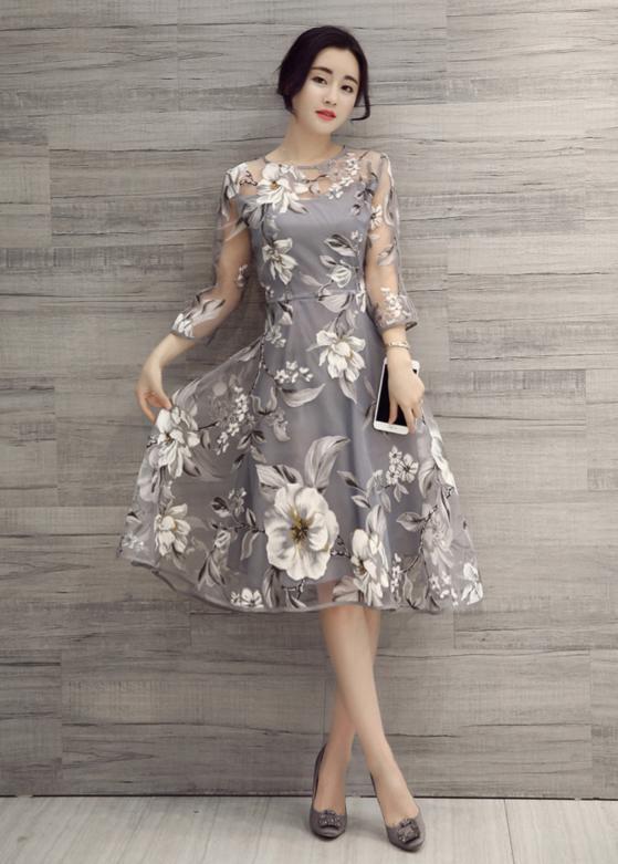 シックなオーガンジーのワンピース。落ち着いたグレーの地にモノトーンの花模様がバランスよくプリントされています。デコルテライン、袖のほんのり肌見せ透け感がエレガントで魅力的な一着です。結婚式や謝恩会などに。背中ファスナー有。裏地あり。