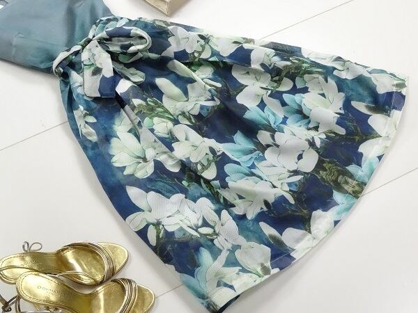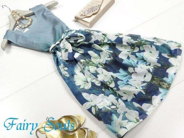 大きな花模様がプリントされたシックなワンピース。全体的に光沢感があり品の良いセクシー感をかもしだしています。ウエストを共布のベルトリボンでキュッと絞るデザイン。シックでやさしくエレガントな一着です。背中ファスナー有。裏地有。
