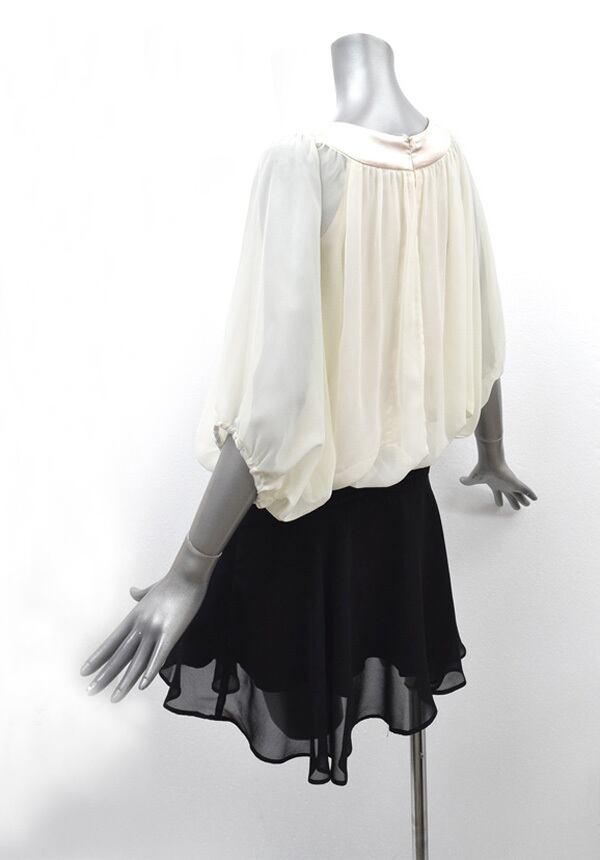 ウエスト切替ビーズ飾りツ-トンカラ-ワンピースです。ふんわりとした優しく上品なイメージを与えてくれます。襟は丸襟で四重のビーズ飾りが素敵です。袖は軽いふんわりドルマンスリ-ブです。裏地付。背中ファスナ-有。