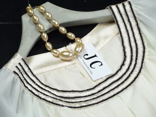 ウエスト切替ビーズ飾りツ-トンカラ-ワンピースです。ふんわりとした優しく上品なイメージを与えてくれます。襟は丸襟で四重のビーズ飾りが素敵です。袖は軽いふんわりドルマンスリ-ブです。裏地付。背中ファスナ-有。