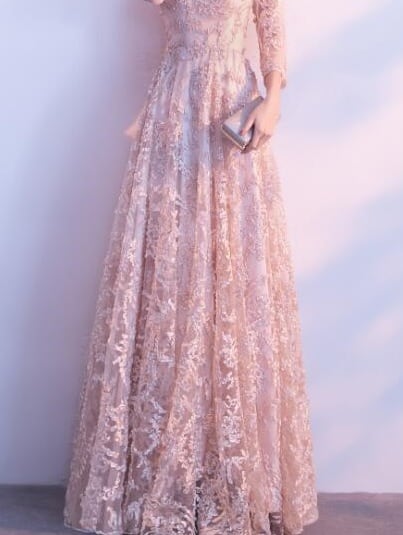 リボン刺繍のパーティ-ロングドレス。袖やデコルテの透け感がとても美しく大人の女性を醸し出してくれるエレガントなデザイン。全体にゴールド系の立体刺繍が施されデザイン性のあるスタイルがとても魅力的な一着です。全体的に優しい感じに仕上げられています。背中ファスナ-有。胸パット付き。裏地有。