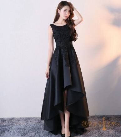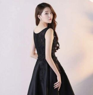 フィッシュテ-ルのパ-ティ-ドレスです。黒のサテン地にトップス部分は立体刺繍が施されとても豪華です。前と後ろの長さが違うフィッシュテールのデザインがエレガントで、パーティやイベント、結婚式など、様々なシーンで、気品のある印象を与えてくれる一枚です。裏地あり。背中ファスナ-有。胸パット付き。