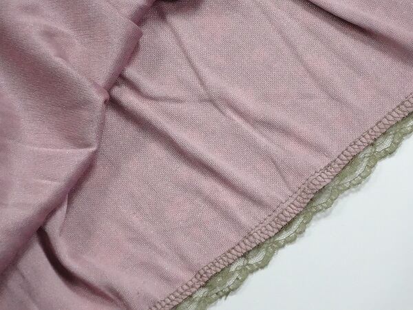 ハイネックデザインで裏地はありませんが透け感はありません。トップス部分のレ-スとウエストリボンベルトが素敵です。裏地なし。首後ろボタン留め有。