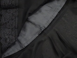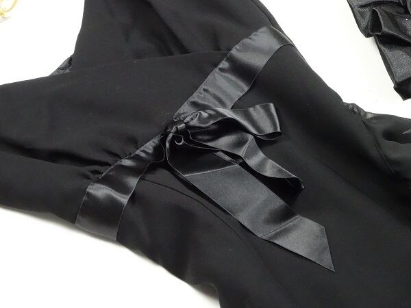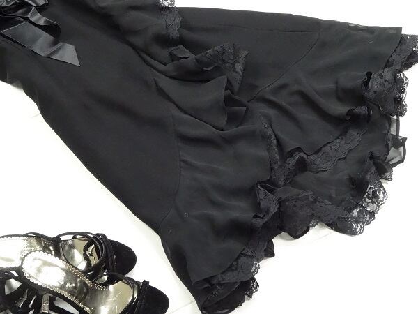 フリルパ-ティ-ワンピースです。胸下のリボンベルトと左サイドのチュールのフリルがクールプリティの中に豪華さをプラスしています。裏地有。