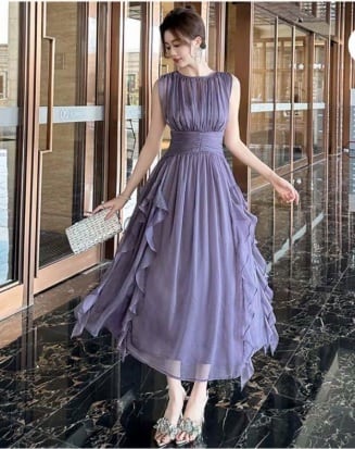 シフォンプリーツのパーティードレス。上半身がレース仕様のワンピースの上に同色のシフォンを重ねたデザインで優しい印象のドレス。胸元はプリーツ仕様で、ウエストで横にタックを取り、スカート部分はサイドにフリルをあしらったゆったりと広がったフレアになっています。パーティやイベント、結婚式など、様々なシーンで、気品のある印象を与えてくれる一枚です。背中ファスナ-有。裏地あり。