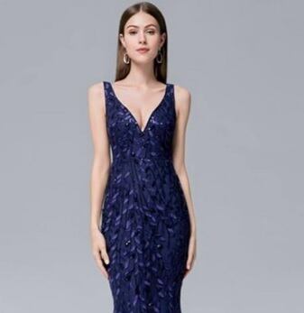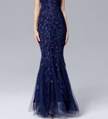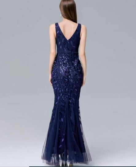 チュールとスパンコールのマーメイドドレス。ネイビーのチュール地に深い同色のスパンコールをふんだんに使用した豪華なデザイン。くびれたウエストがセクシーさを醸し出しています。パーティやライブ、イベントなど華やかなシーンに。デザイン上伸縮性はそれほどなく体のラインにフィットしたシルエットです。背中ファスナー有。裏地有。