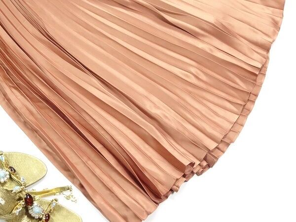 滑らかなサテン調光沢プリ-ツスカ-トです。動くたびに揺れるエレガントなスカ-トです。サイドファスナ-有。裏地あり。