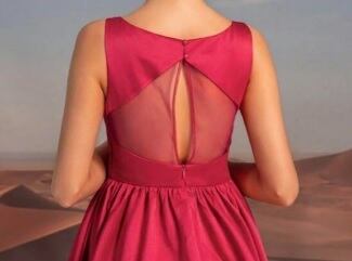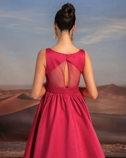 フィッシュテールの赤いロングドレス。高めのウエストラインで脚長効果があります。前と後ろで着丈の長さが異なるフィッシュテールのデザインで、背中は、首元でボタン留め、首元からウエストまではチュールで中央が開いており、ウエストから下がファスナー仕様になっています。華やかで豪華なデザインですので、結婚式のお色直しや前撮り撮影、パーティやコンサートなどにもお勧めです。気品のある印象を与えてくれる一着です。裏地なし。背中首元ボタン留め、ウエストから下ファスナー仕様。胸パット付。