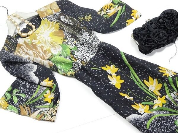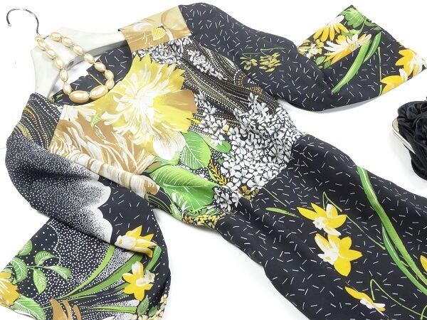 和柄幅広袖仕様のロングワンピース。黒地にシックな色合いの和柄をプリント。袖は先に向けて広がり着物の袖を思わせます。大胆な柄と、鮮やかな紫の裏地が、派手過ぎず、大人の落ち着いた雰囲気を醸し出してくれています。パーティや結婚式、コンサートなど、様々なシーンで活躍してくれる一着です。背中ファスナー。裏地あり。