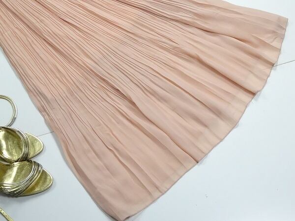 やわらかなピンクカラーのロング丈切替プリ-ツワンピースです。トップス部分は首回りパール飾りでウエストから下は繊細なプリーツ仕様で、女性らしい動きを美しく魅せてくれる一着です。裏地あり。ファスナ-なし(かぶるタイプ)。