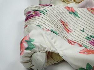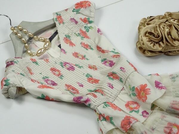 薄いベ-ジュの下地の上に鮮やかな花模様の刺繍が施されたワンピース。全体のバランスが程よい綺麗なフォルムの一着です。パーティやイベントなど、どんなシーンにも活躍してくれます。裏地あり。