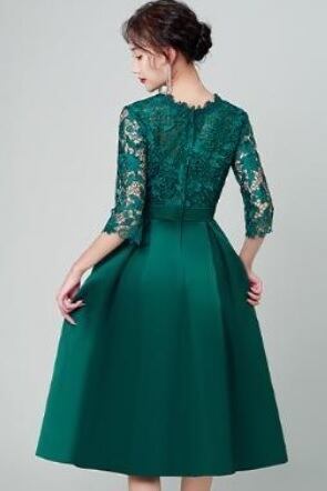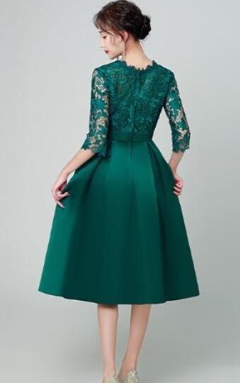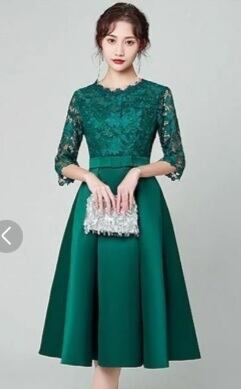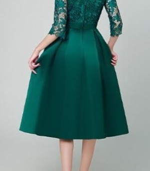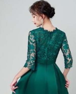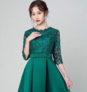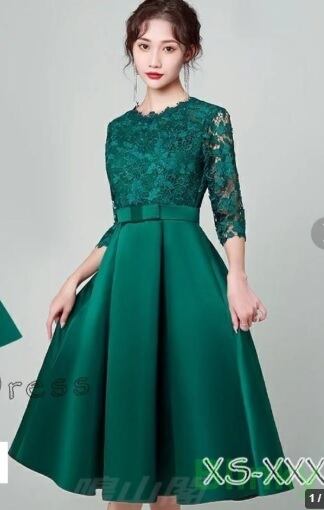エレガントパ-ティ-ドレスです。気品に満ちたとてもエレガントで上品なひとクラス上をいく一品です。トップス部分のレースの透け感もとても上品でエレガントです。裏地有。背中ファスナ-有。胸パット付き。