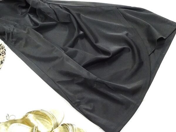 カシュクール長袖レース仕様のワンピース。伸縮性のある黒のジャージ素材。胸元はカシュクール仕様。左胸から左袖と右袖は黒地にベージュの薔薇柄レース。スカート部分はウエストにタックをとり、ふんわりとしたデザイン。ちょっとおしゃれな普段使いはもちろん、パーティや結婚式の二次会などにも。ファスナーなしのかぶるタイプ。裏なし。