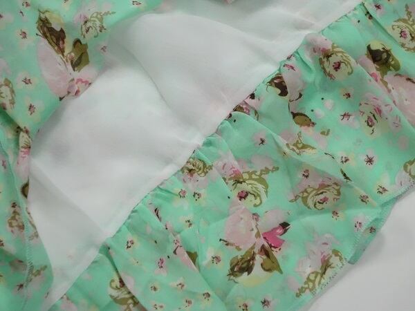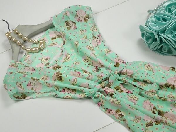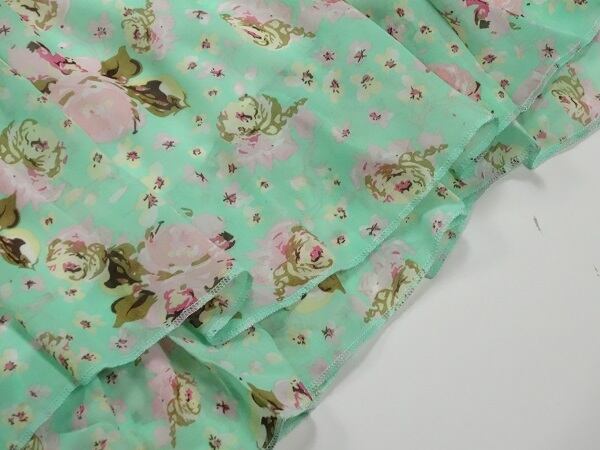スイートグリーン花柄シフォンのロングワンピ-ス。淡いペパーミントグリーンにピンクの小花を散りばめ、小さなふんわりとした袖がやさしい印象に仕上げています。共布ウエストリボンベルトでアクセントをつけて。シンプルなフォルムは飽きのこないデザイン。様々なシーンで活躍してくれる一着です。ファスナ-なしのかぶるタイプ。裏地あり。