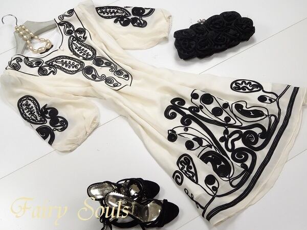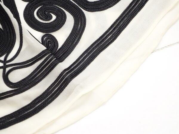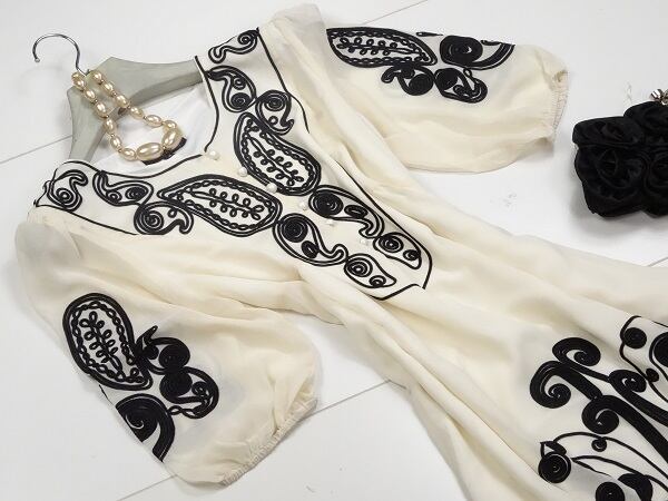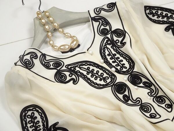 パイピングアートがとても印象的なシフォン素材のワンピースです。胸元や裾や袖に施されたパイピングアートがとても繊細で優しい印象を与えてくれます。シフォンの柔らかな素材は、肌触りもとても良いです。前ボタン6個あり。裏地あり。