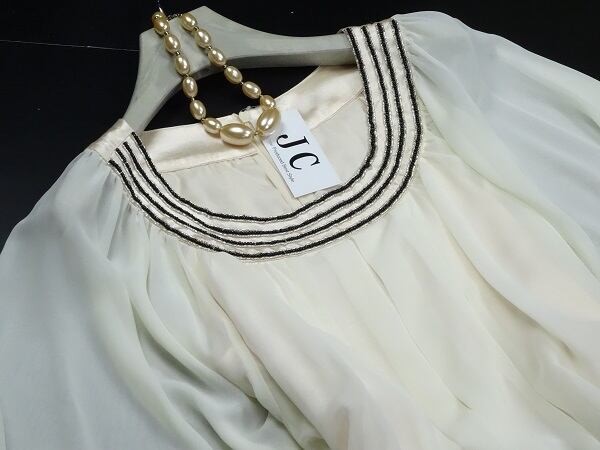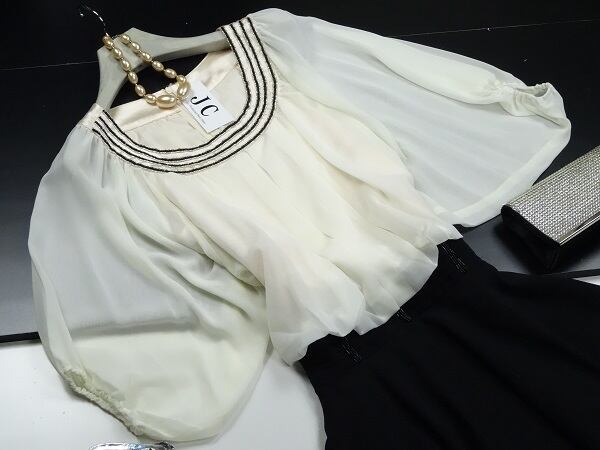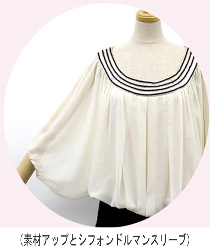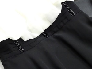 ウエスト切替ビーズ飾りツ-トンカラ-ワンピースです。ふんわりとした優しく上品なイメージを与えてくれます。襟は丸襟で四重のビーズ飾りが素敵です。袖は軽いふんわりドルマンスリ-ブです。裏地付。背中ファスナ-有。